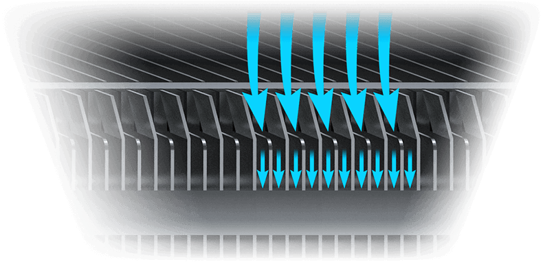 Tản nhiệt được làm thủ công tinh xảo với các cánh tản nhiệt lớn theo mảng giúp mở rộng bề mặt tiếp xúc, dẫn đến khả năng làm mát tốt hơn. Các vây góc cạnh và không bằng nhau tạo ra nhiều không gian hơn để dẫn luồng không khí tốt hơn.